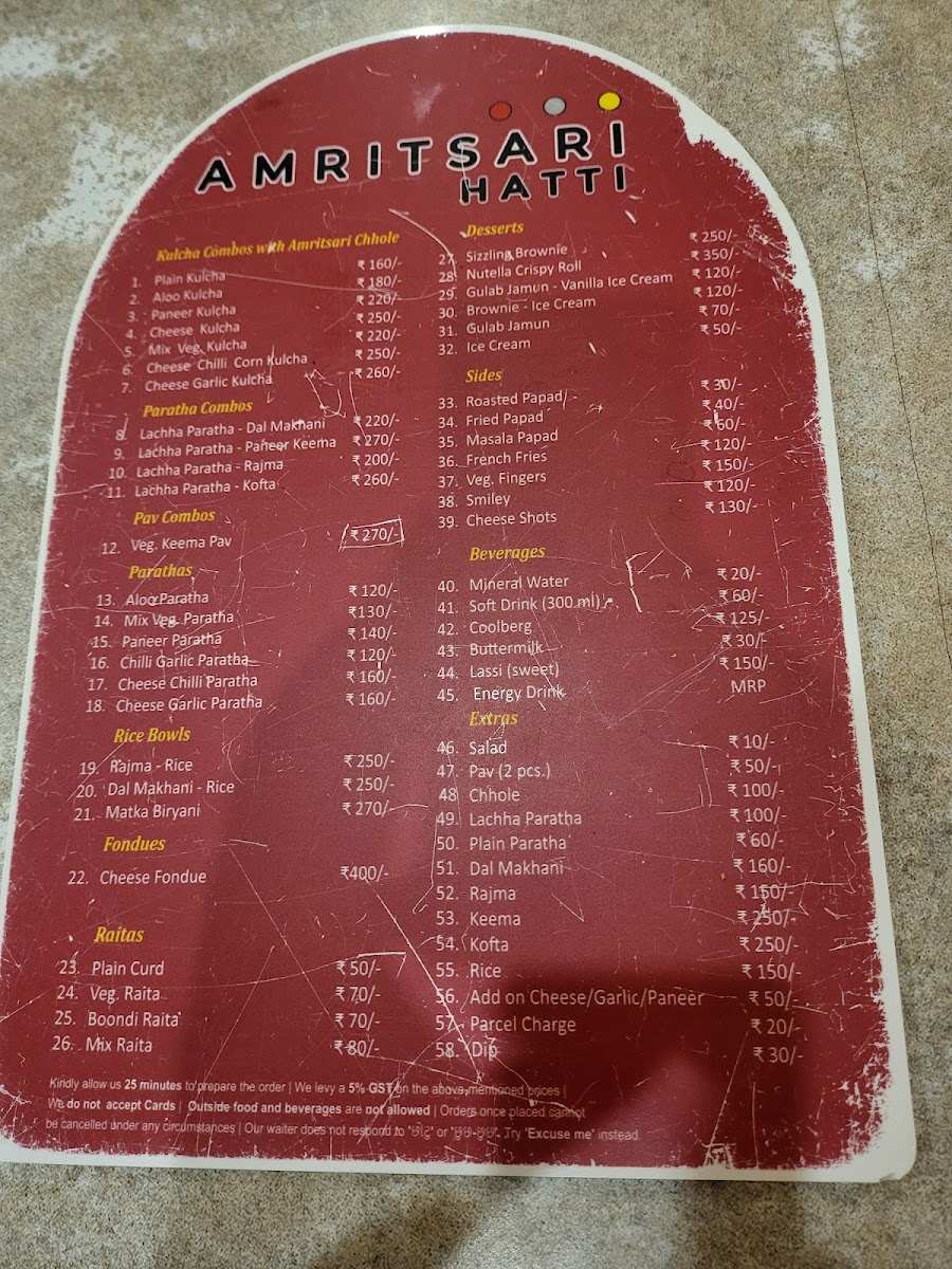 For those seeking main meal options, the Kulcha Combos served with Amritsari Chhole feature multiple varieties such as Plain Kulcha, Aloo Kulcha, Paneer Kulcha, Cheese Kulcha, Mix Veg Kulcha, Cheese Chilli Corn Kulcha, and Cheese Garlic Kulcha. This selection caters to traditional and cheese-based preferences.